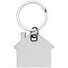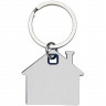 - ОбзорБрелок для ключей в форме домика с цветной вставкой из пластика между 2-мя серебристыми пластинами из стали.