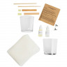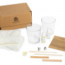 В набор входят сама свечная масса экологичного состава (соевый и кокосовый воск, пищевой парафин), 2 стеклянных стакана, деревянные фитили и держатели, отдушки с ароматами уд-бобы тонка и табак-ваниль и ленточка для декора.