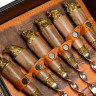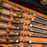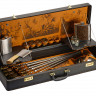 - ОбзорКейс из сплит-кожи, с повышенной износостойкостью, внутренняя отделка натуральная кожа с художественным выжиганием В комплект входит: Фляга 240 мл (нерж.сталь)– 1шт. Фляга 480 мл (нерж.сталь)- 1шт. Стопка 40 мл (стекло)- 6шт. Фонарик- 1шт. Тарелка (нейзильбер)- 6шт. Нож разделочный (нерж. сталь) 45х13, рукоять орех, бронзовое литье– 1 шт. Шампура 670 мм (нерж. сталь) ручка орех, бронзовое литье– 6 шт.