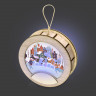 - ОбзорНовогодняя подвеска для елки станет прекрасным вариантом подарка: посмотрите, эти игрушки видно не только при свете дня, но и в темноте, ведь они могут светить сами! Игрушка с подсветкой выполнена из фанеры, фрагмент с изображением — напечатан на пропускающем свет материале. Подвеска сияет мягким разноцветным светом, подчеркивая пейзаж. Станет прекрасным вариантом для подарка, который будет радовать ваших адресатов долгие годы, каждую зиму красуясь на зеленых лапах елки.