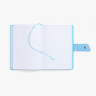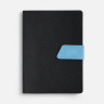 Ежедневник с гибкой обложкой, выполнен из материала La Fite, черный АА и Nubuck Touch, голубой, дополнен голубым ляссе и хлястиком на кнопке.
