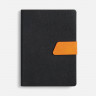 Ежедневник с гибкой обложкой, выполнен из материала La Fite, черный АА и Nubuck Touch, оранжевый, дополнен оранжевым ляссе и хлястиком на кнопке.